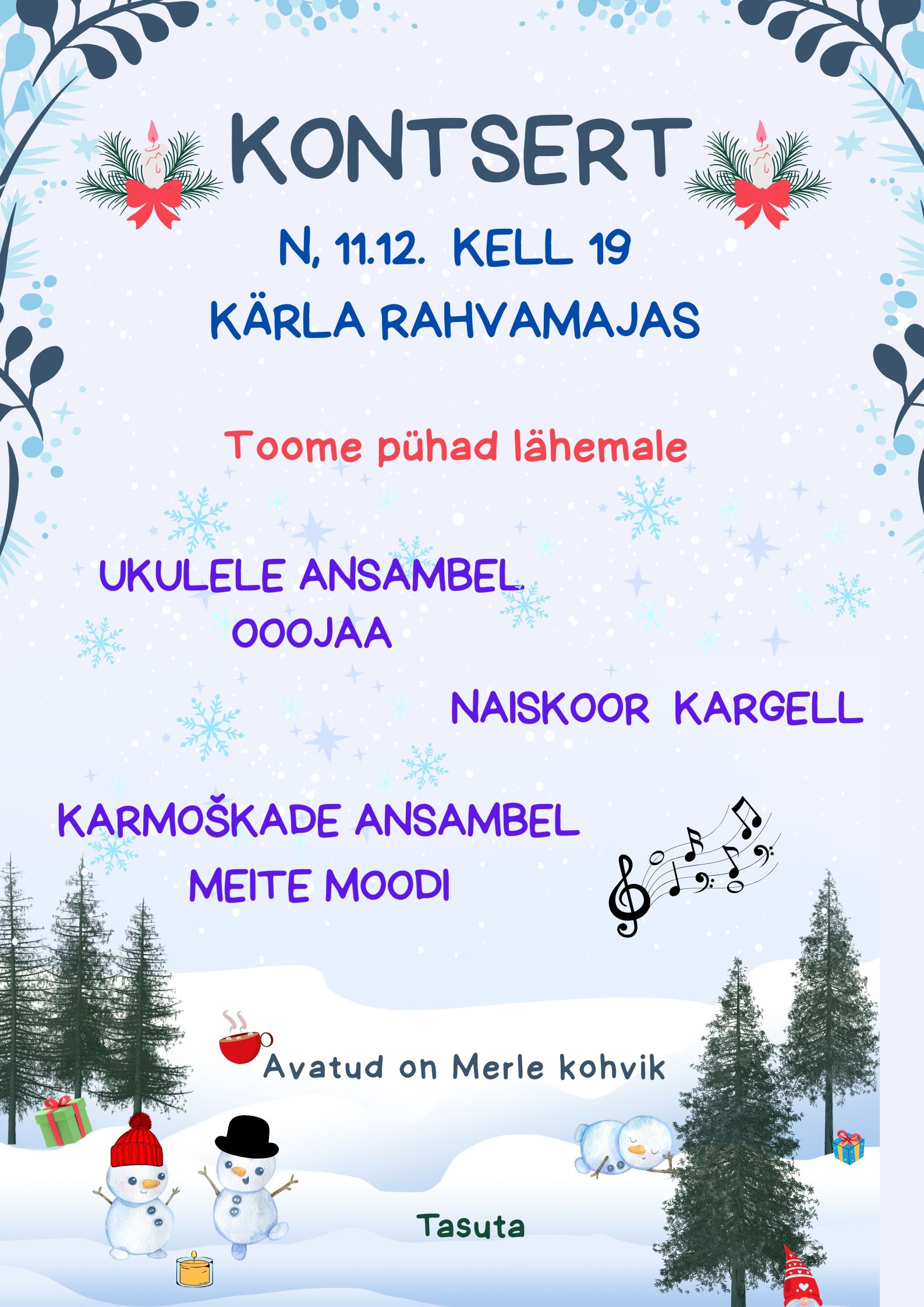 Esinevad ukuleleansambel OOOJAA, karmoškade ansambel MEITE MOODI ja naiskoor KARGELL. Avatud Merle kohvik.