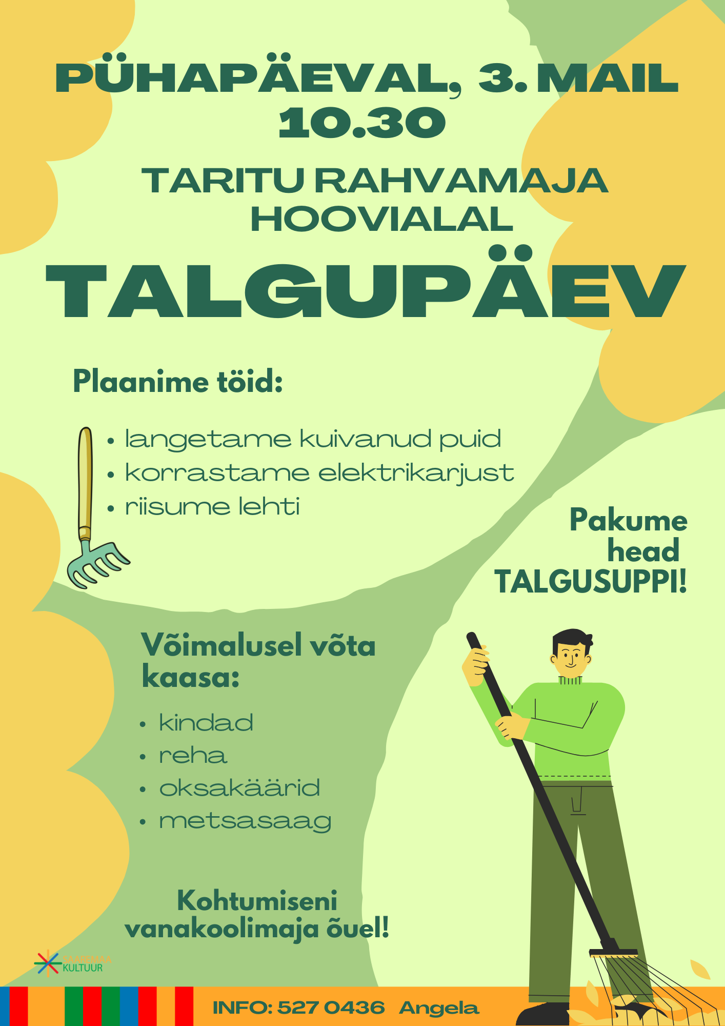 03 mai 2026, 10:30 - 14:30 TALGUPÄEV Taritu rahvamaja Tasuta Тutvustus Korraldaja Asutus Saaremaa Kultuur Aadress Koolimaja Taritu küla 93331 Saare maakond Eesti Kontaktisik Angela Jelissejev E-post angela.jelissejev@saarekultuur.ee Meedia vaadatud 4 korda Jaga sõpradele Тutvustus Aadress Saaremaa